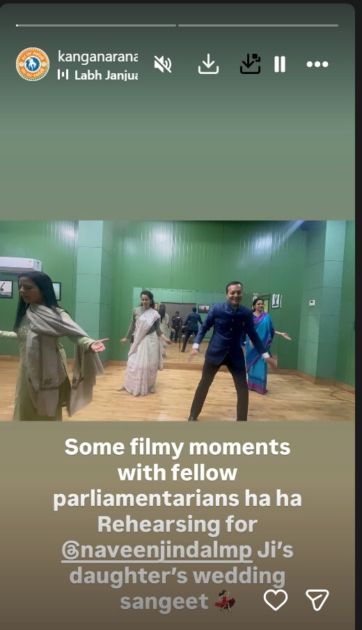 कंगना रनौत ने डांस रिहर्सल की तस्वीर शेयर करते हुए कैप्शन में लिखा, ‘साथी सांसदों के साथ कुछ फिल्मी पल.. नवीन जिंदल जी की बेटी की शादी के संगीत समारोह की रिहर्सल कर रही हूं.’